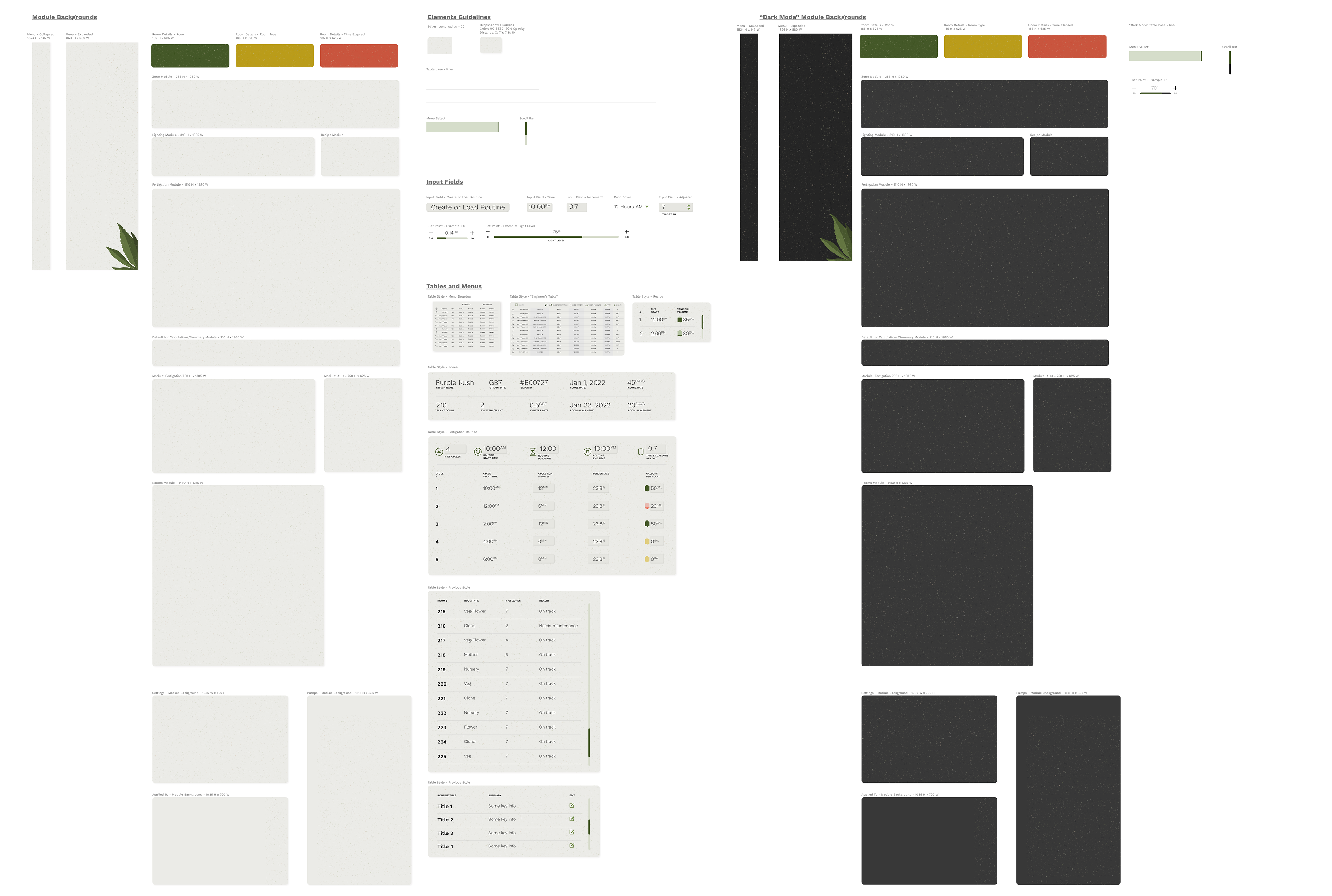 In addition to building the Grow Room display screens, the screens that cultivators and engineers use needed a visual update as well as some slight UX changes. Similar to the Grow Room screens, these screens display room info and data in order to monitor and care for plant growth. However, unlike the Grow Room displays, these screens allow the cultivator/engineer to make adjustments as needed.